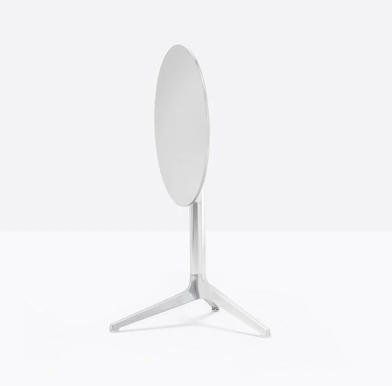 Table with three aluminum legs and extruded aluminum column, available combined with tops of different sizes and finishes