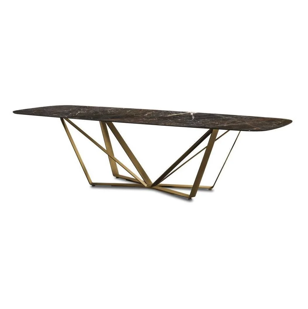 Dining table with iron base in Grafite or in satin brass, dark brass, titanium, dark titanium finishing.